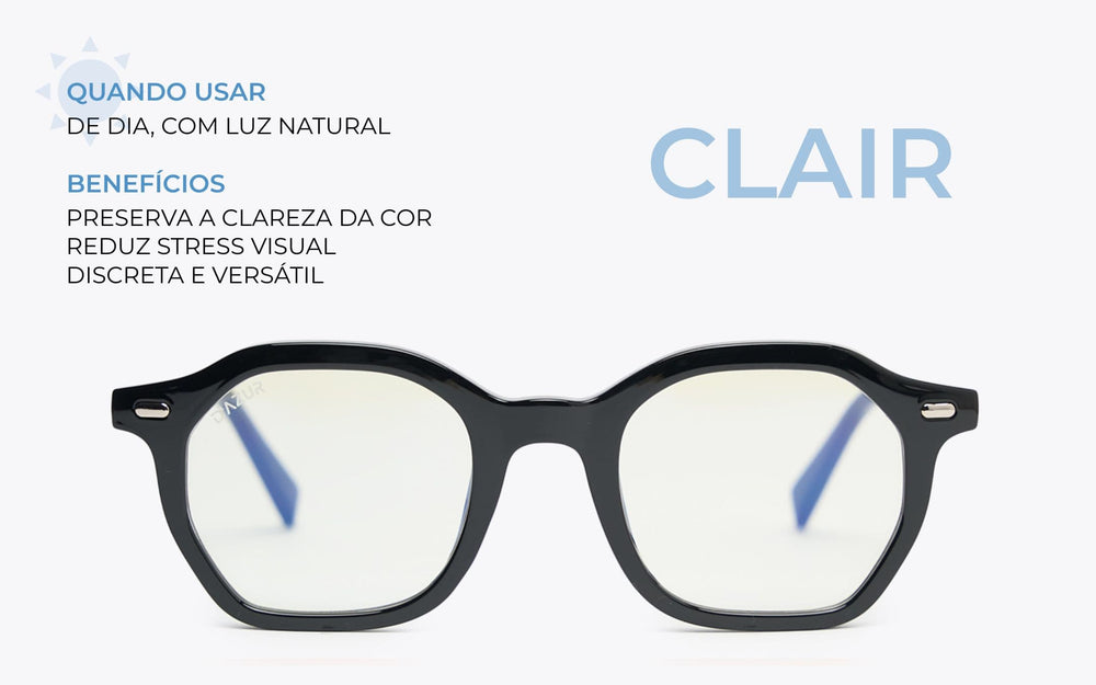 Lente CLAIR (transparente) bloqueia luz azul de baixa intensidade, ideais para uso diurno.